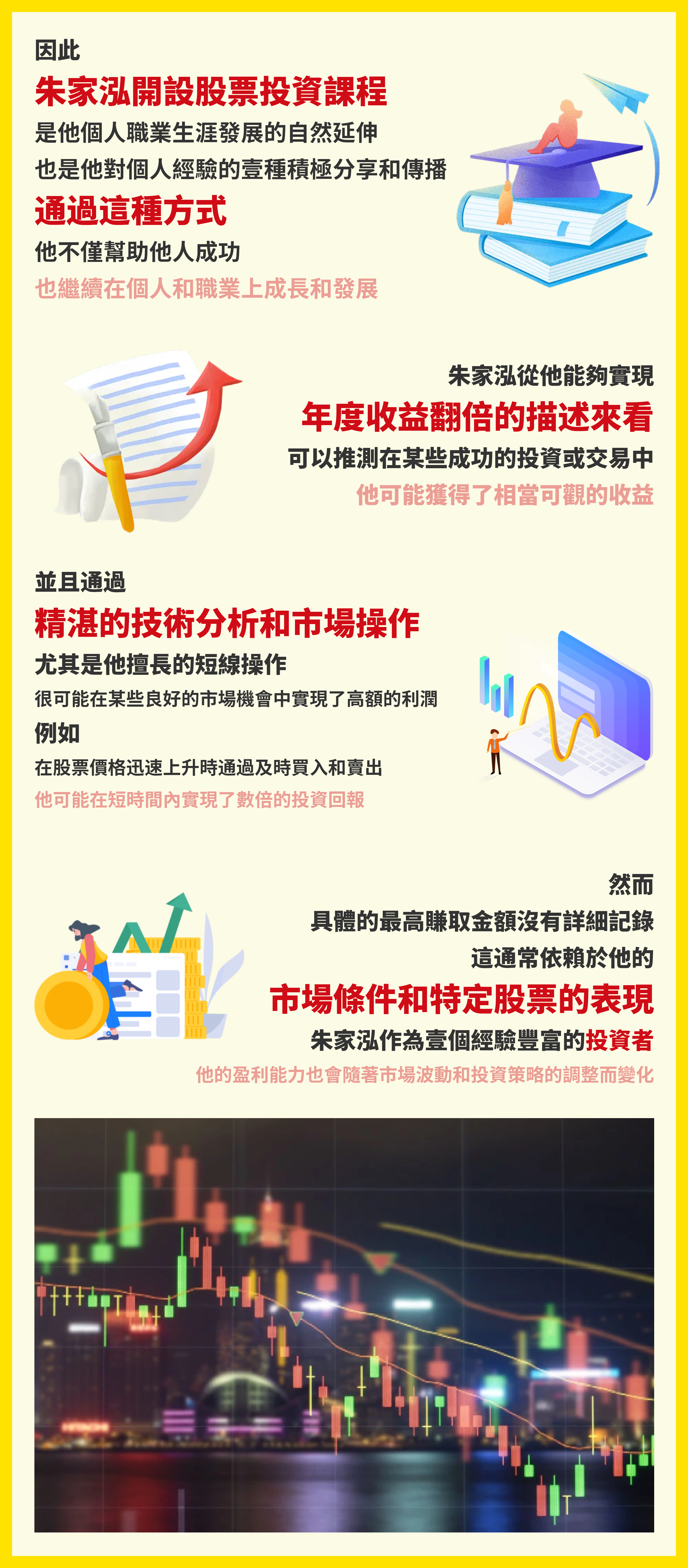 作為壹個成功的投資者,朱家泓意識到自己有責任和機會通過教育幫助他人,提高他們的投資技能,這不僅可以幫助他人實現財務自由,也是他回饋社會的壹種方式。